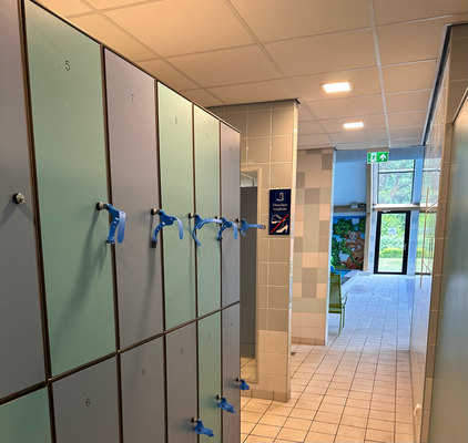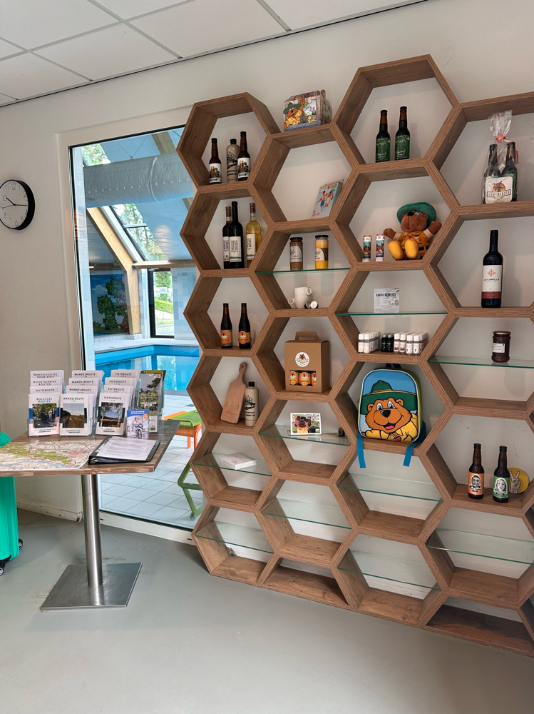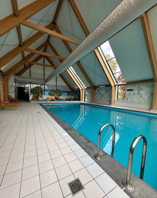 We halen de sleutels van de accommodaties die we gaan bekijken op bij de receptie. Hier worden we vriendelijk ontvangen en zien we direct het zwembad met peuterbad. Deze bevindt zich in hetzelfde gebouw als de receptie, koffiecorner en indoorspeeltuin.