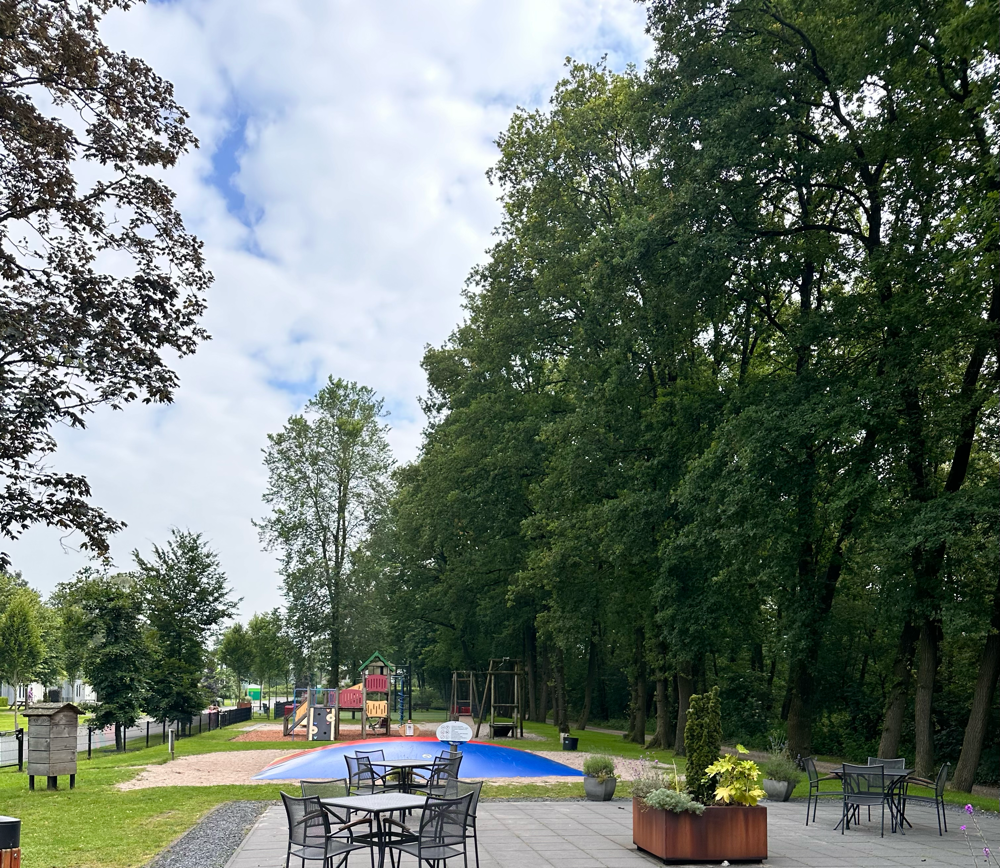 Als we naar het vakantiepark toerijden valt het ons op dat deze echt midden in de natuur ligt, hier houden we van! Het is zaterdagochtend en we zien aardig wat mountainbikers die onderweg zijn naar de mountainbikeroute die dicht bij het vakantiepark ligt. Als we de oprijlaan van het vakantiepark oprijden zien we aan de linkerkant gelijk een aantal leuke faciliteiten liggen voor kinderen. Er is een minigolfbaan, een multifunctioneel speelveld en een speeltuin met een tof luchtkussen! Aan de rechterkant zien we de familiebungalows liggen, met een peuterspeeltuintje en omheinde tuin. Perfect voor een vakantie met kinderen!