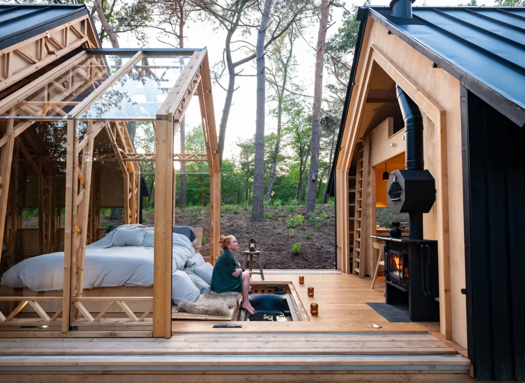 Vanaf het moment dat je aankomt, voel je het: hier draait alles om loslaten. Geen haast, geen prikkels, alleen jij, de natuur en een prachtig ontworpen houten retreat waar binnen en buiten naadloos in elkaar overvloeien. Dankzij de verplaatsbare glazen en houten wanden bepaal je zelf hoe open of beschut je de ruimte maakt. Op warme dagen zet je alles open en val je letterlijk in slaap onder de sterrenhemel, met enkel het geritsel van bladeren en het gezang van vogels als achtergrondmuziek.